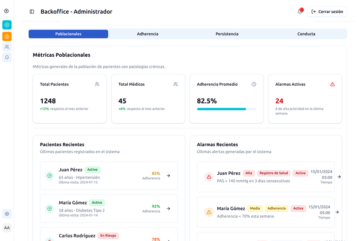 Pacientes reciben recordatorios y educación personalizada, mientras los equipos médicos obtienen alertas para intervenir oportunamente.